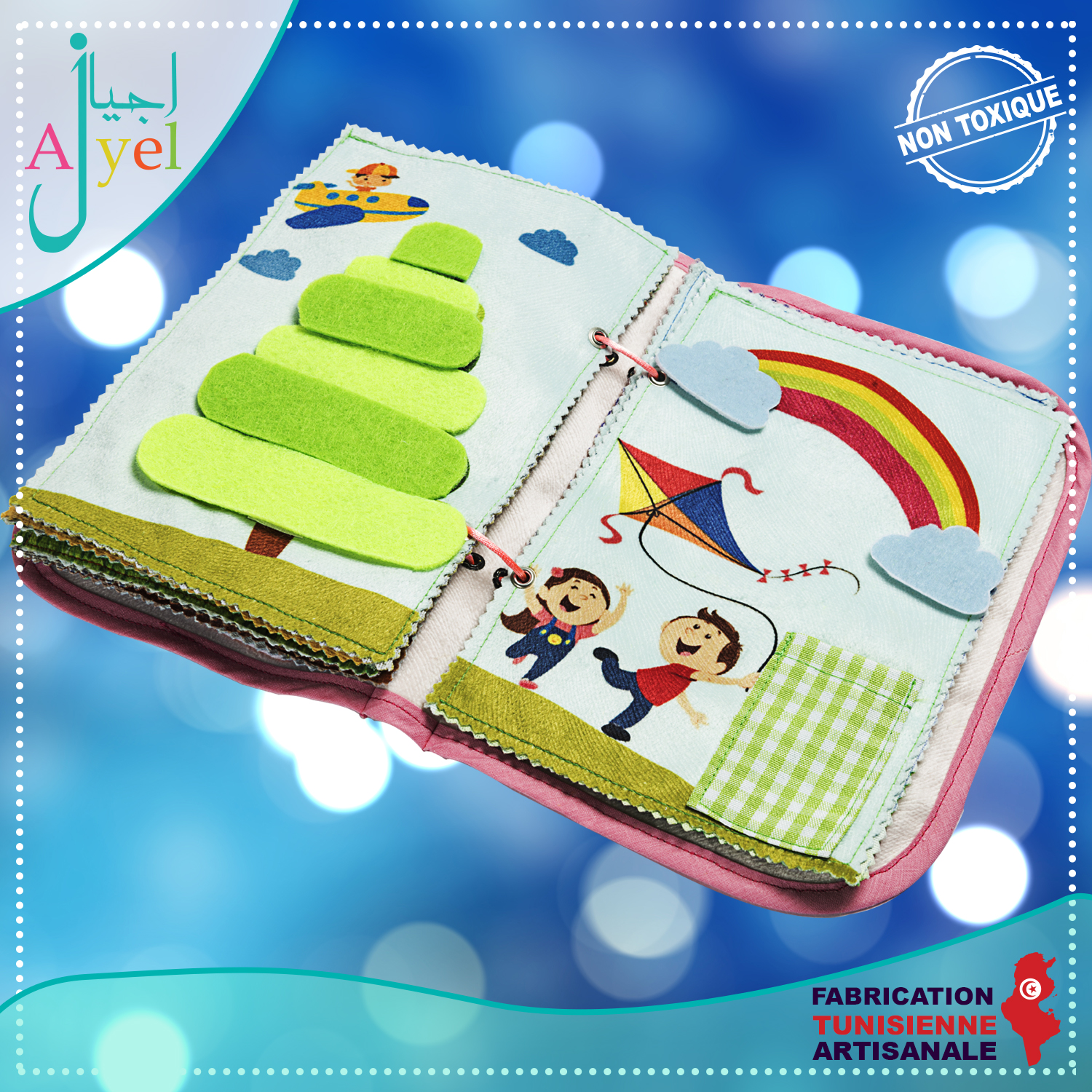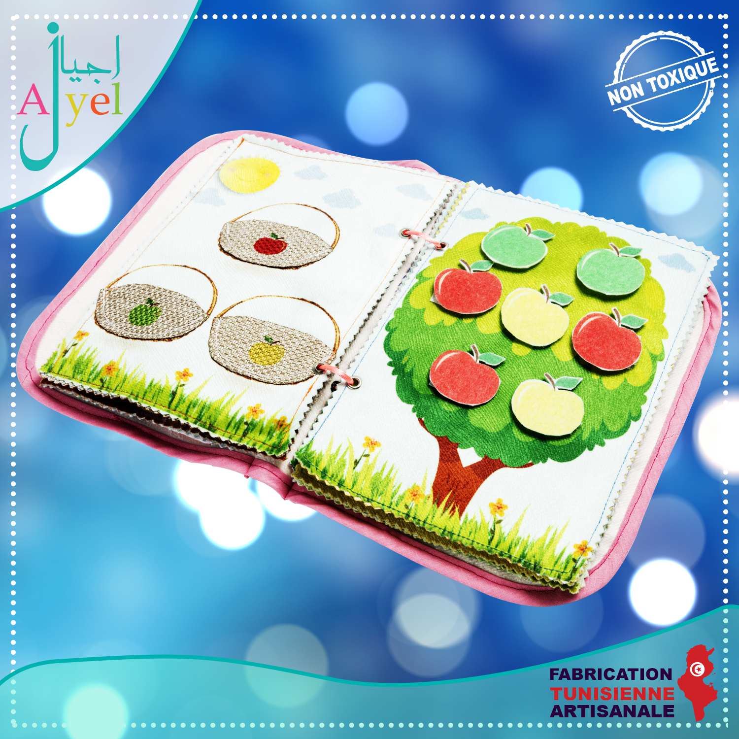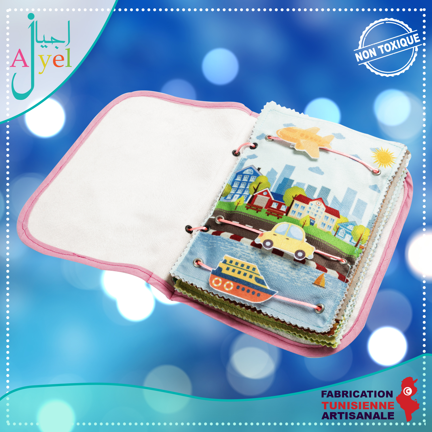 Livre en tissu avec de nombreuses activités inspirées de la méthode Montessori à la fois ludique et éducatif pour favoriser l'éveil de votre enfant.