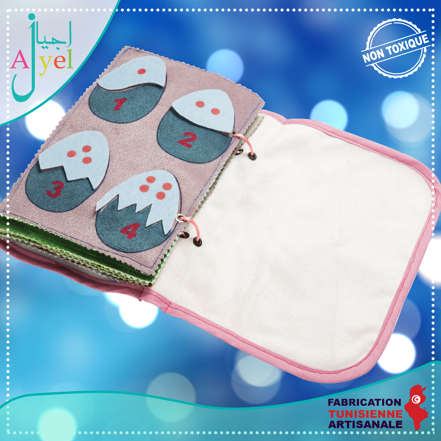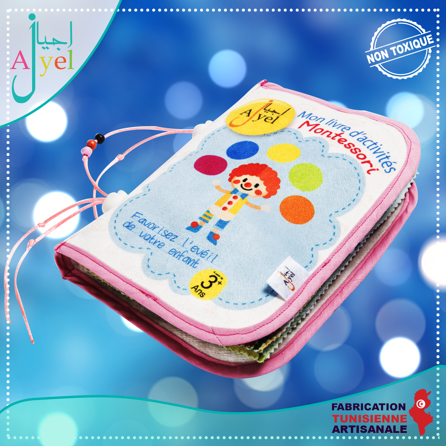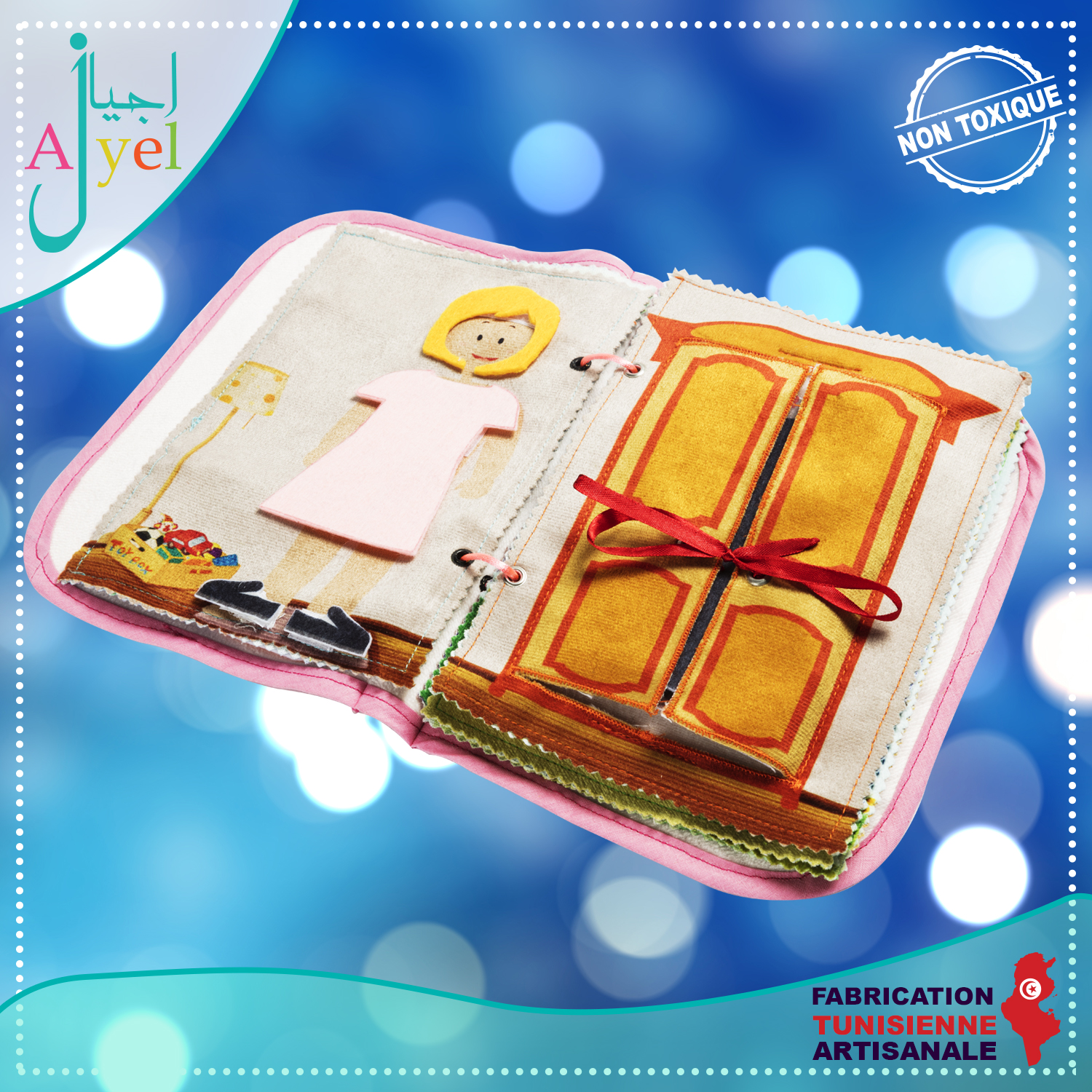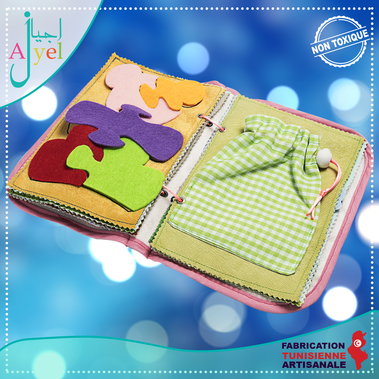Livre en tissu avec de nombreuses activités inspirées de la méthode Montessori à la fois ludique et éducatif pour favoriser l'éveil de votre enfant.