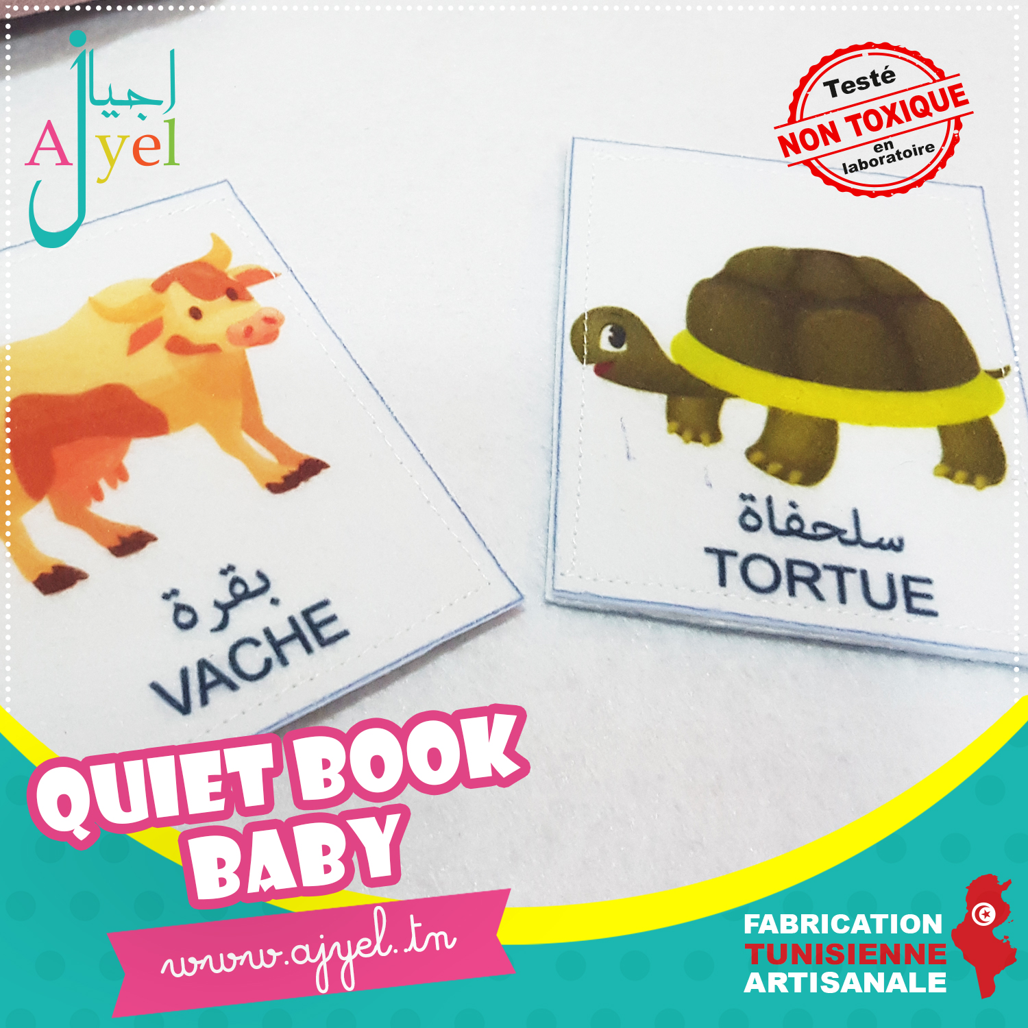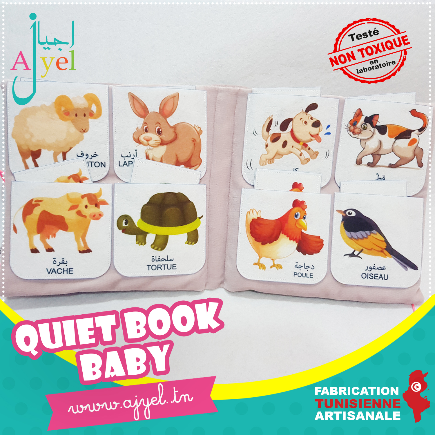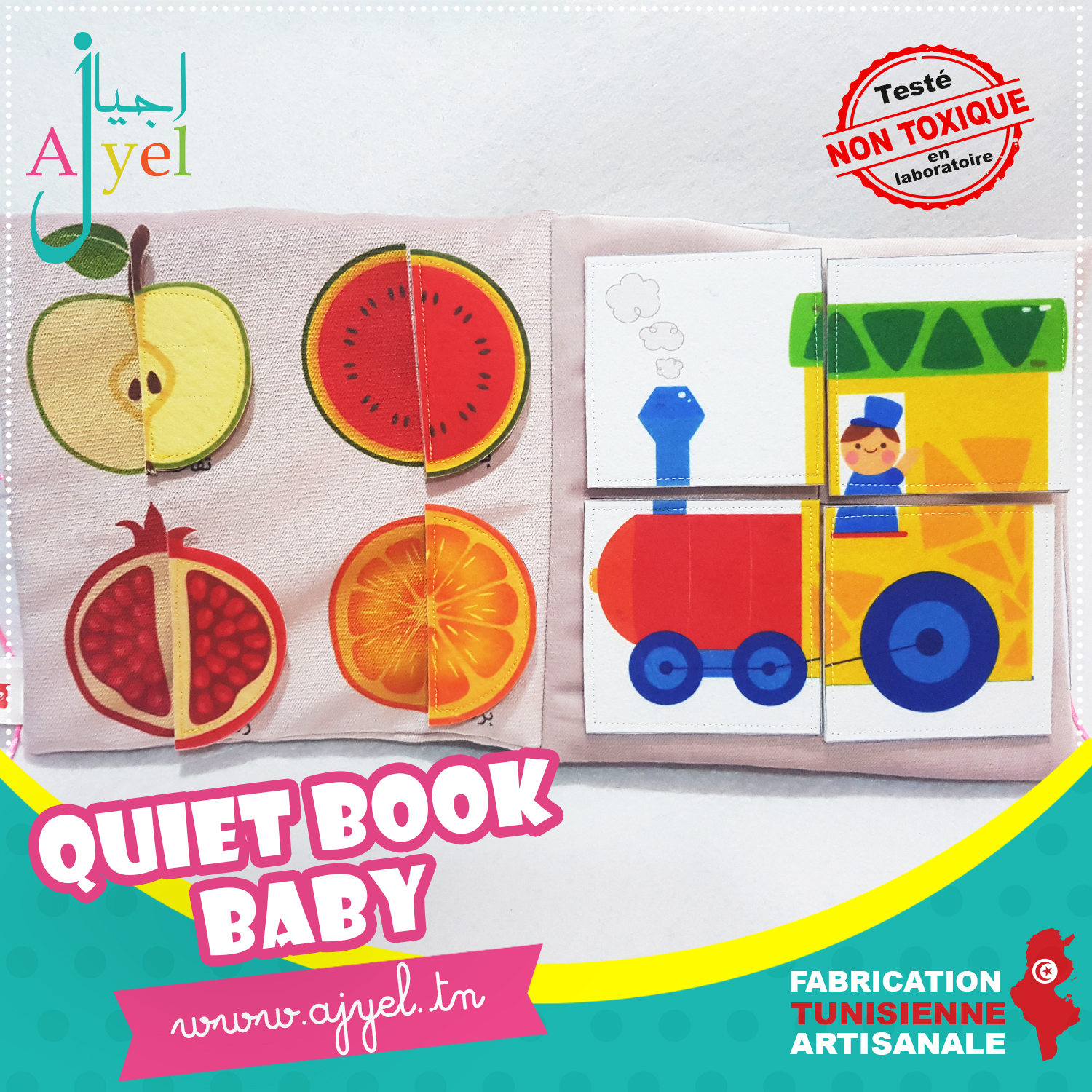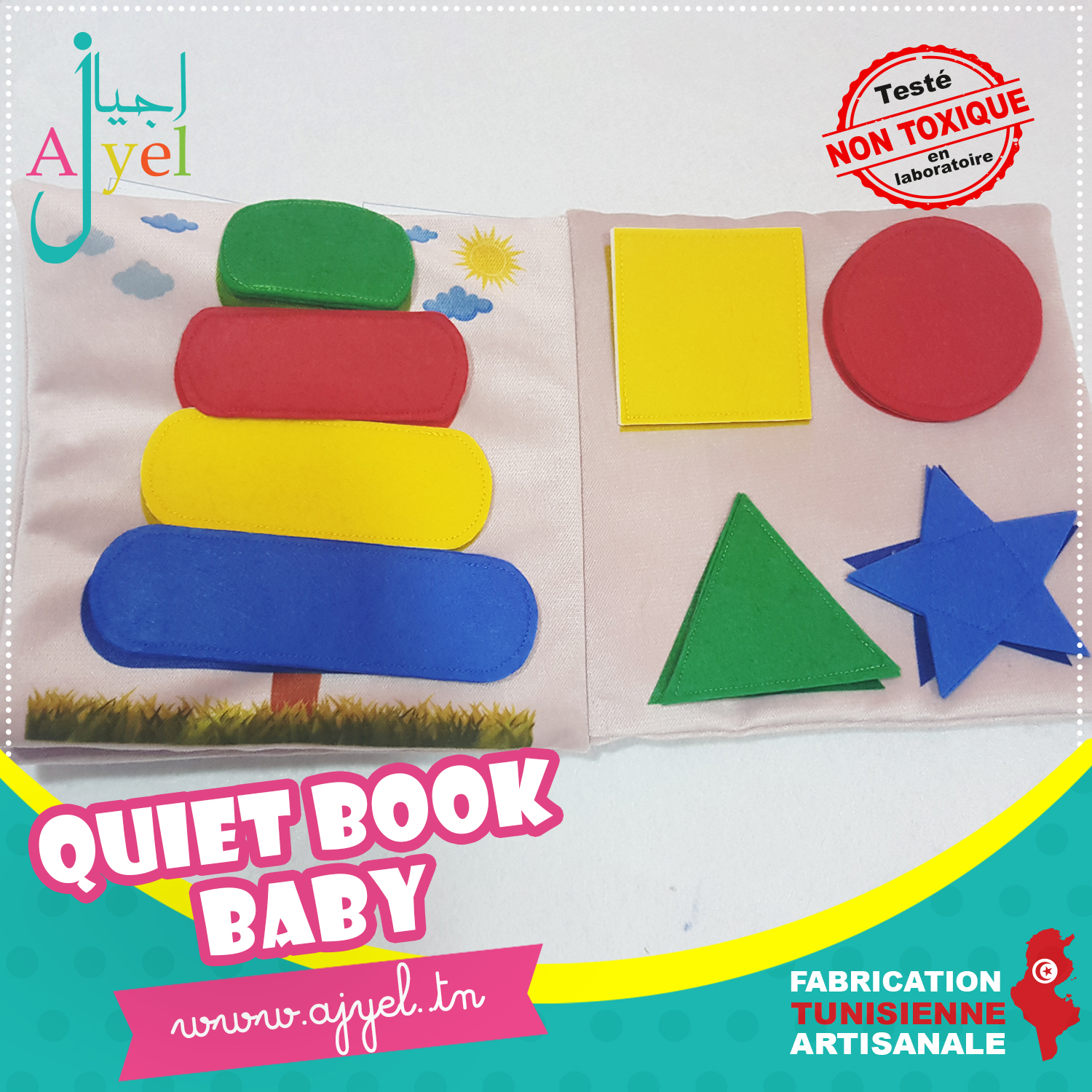 Livre en tissu avec de nombreuses activités inspirées de la méthode Montessori à la fois ludique et éducatif pour favoriser l'éveil de votre enfant.